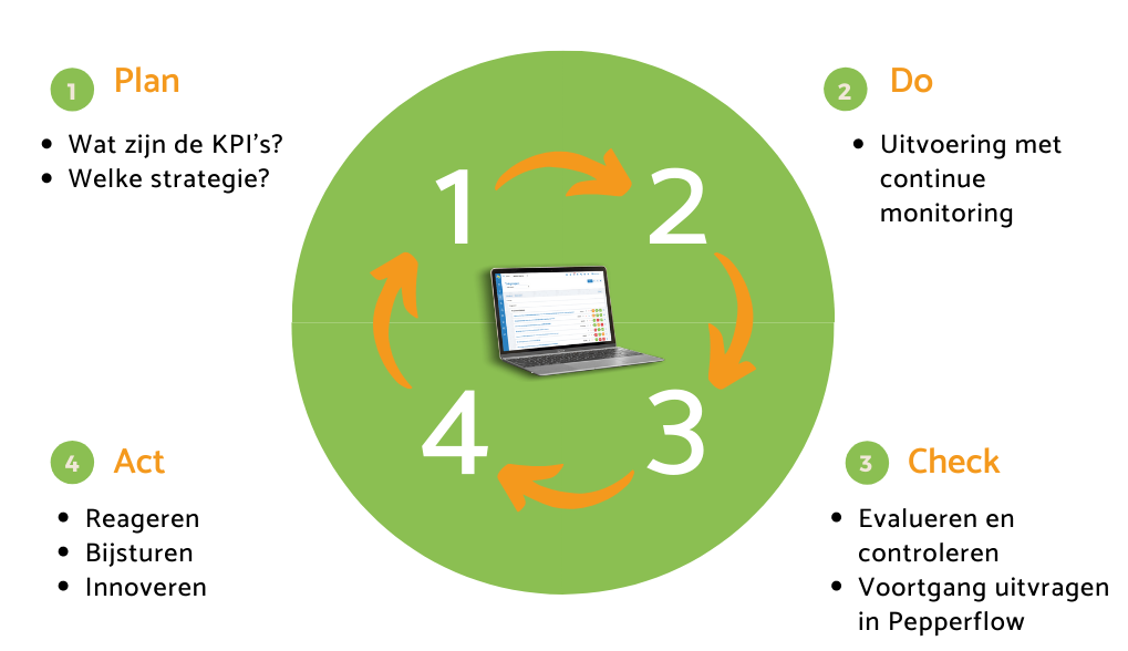 Plan, do, check act. Dat concept staat aan de basis van het werken met Pepperflow. Binnen al onze functionaliteiten is het cyclisch werken, controleren en verbeteren de motor voor alle processen. Zo stimuleert u verbetering, zijn plannen duidelijk en opvolgbaar, worden fouten gecorrigeerd en is verantwoordelijkheid helder. Meer weten over de functionaliteiten van Pepperflow? Klik dan op de button hieronder.